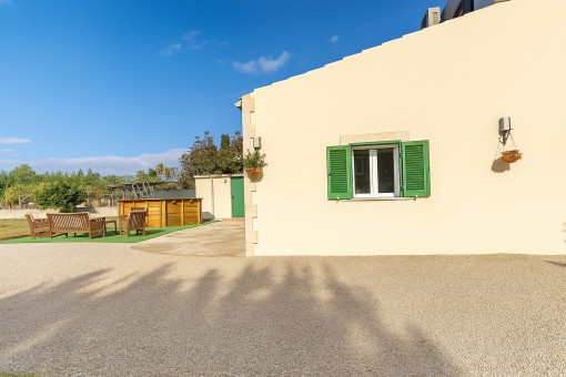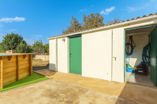 Outside, several storage rooms and covered terraces provide extra space and flexibility, while the surrounding land with almond and fruit trees offers open views of the Serra de Tramuntana.