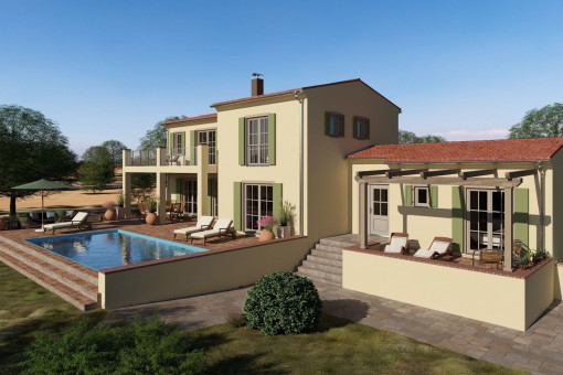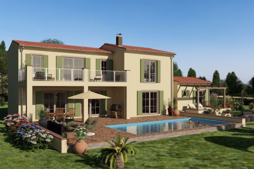 The planned residence extends over the basement, first floor and upper floor and offers approx. 210 m² of living space. Spacious terraces, a covered porch, a stylish pergola of approx. 100 m² in total and a 35 m² swimming pool create an exclusive ambience for relaxed living under the Mallorcan sun.