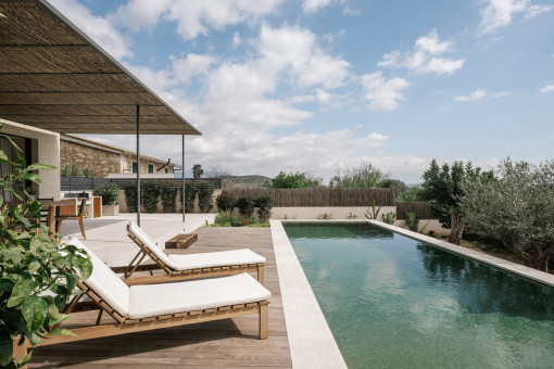 Further features include a kitchen fully fitted with top-branded appliances from Neff, Bora and Miele, underfloor heating and centralised air conditioning via a heat pump, exposed ceiling beams, natural stone and oak-wood floors, high-quality fitted wardrobes, floor-to-ceiling windows with double glazing, an alarm system, a 2-cargarage, an automatic irrigation system in the garden, outdoor BBQ and much more.