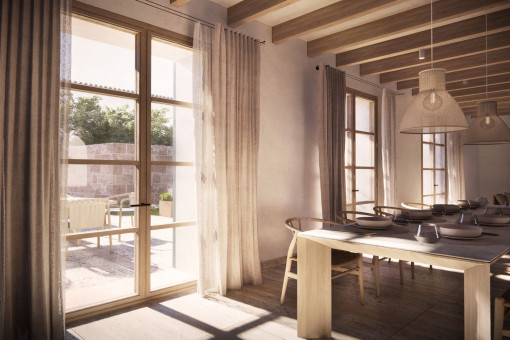 This renovation project in Lloret de Vista Alegre impresses with its quiet location, the lovingly landscaped garden and a private pool with approx. 25 m² of water. Particular emphasis has been placed on preserving the original elements. Natural stone walls, a historic well and exposed wooden beams have been carefully preserved and underline the authentic character of the house.