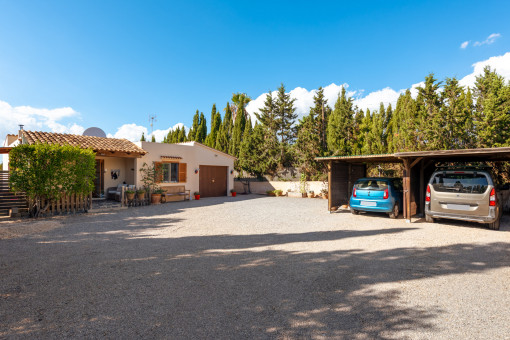 A paved access road leads directly to the property. Upon arrival, you are welcomed by a generously designed courtyard featuring two carport spaces, a small garden, and a garage (approx. 20 m²) currently used as a workshop and bicycle storage.