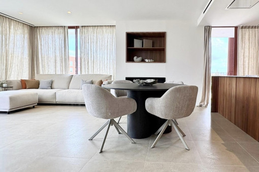 The highlight of this penthouse is the generous outdoor space. It offers a 53 sqm terrace on the living level plus a private roof terrace of 105 sqm, with spectacular panoramic views of Palma and the sea.