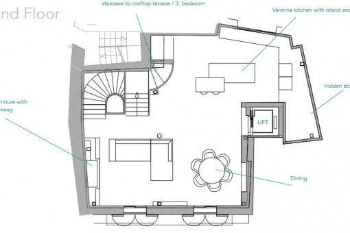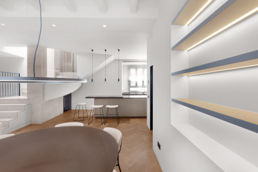 The entrance area provides a traditional ambience with a typical Mallorcan stone floor and modern wooden elements. A private garage with an elaborate ceiling design, indirect lighting elements, and Mares stone walls provides ample space for a car. There is also a convenient lift connecting all levels of the house, including the terrace.