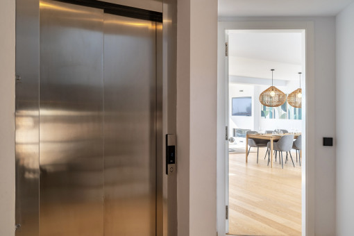 Via the internal staircase or the elevator you reach the upper floor. This level features the master bedroom with its own bathroom and private walk-in dressing room, a guest WC, and the open-plan living and dining area with an American-style kitchen. Each room is characterized by floor-to-ceiling windows, creating a warm and inviting living atmosphere.