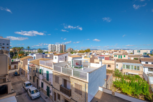 With a constructed area of approximately 181 sqm, the apartment offers ample space and potential for customization. It comprises 4 bedrooms, 2 bathrooms, a spacious living and dining area with a fireplace, a kitchen, and a rear-facing balcony. From this balcony, a spiral staircase leads to a private terrace with a separate room, ideal for a guest room, office, or hobby space. From the rear side, the view extends to the Tramuntana Mountains.