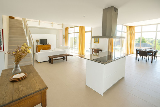 The house has a living area of approx. 200 qm, spread over 2 floors. The open-plan living and dining area with modern kitchen has floor-to-ceiling glass doors with access to the sun terrace and pool area. There are a total of 3 double bedrooms and 2 bathrooms, one of which is en suite.